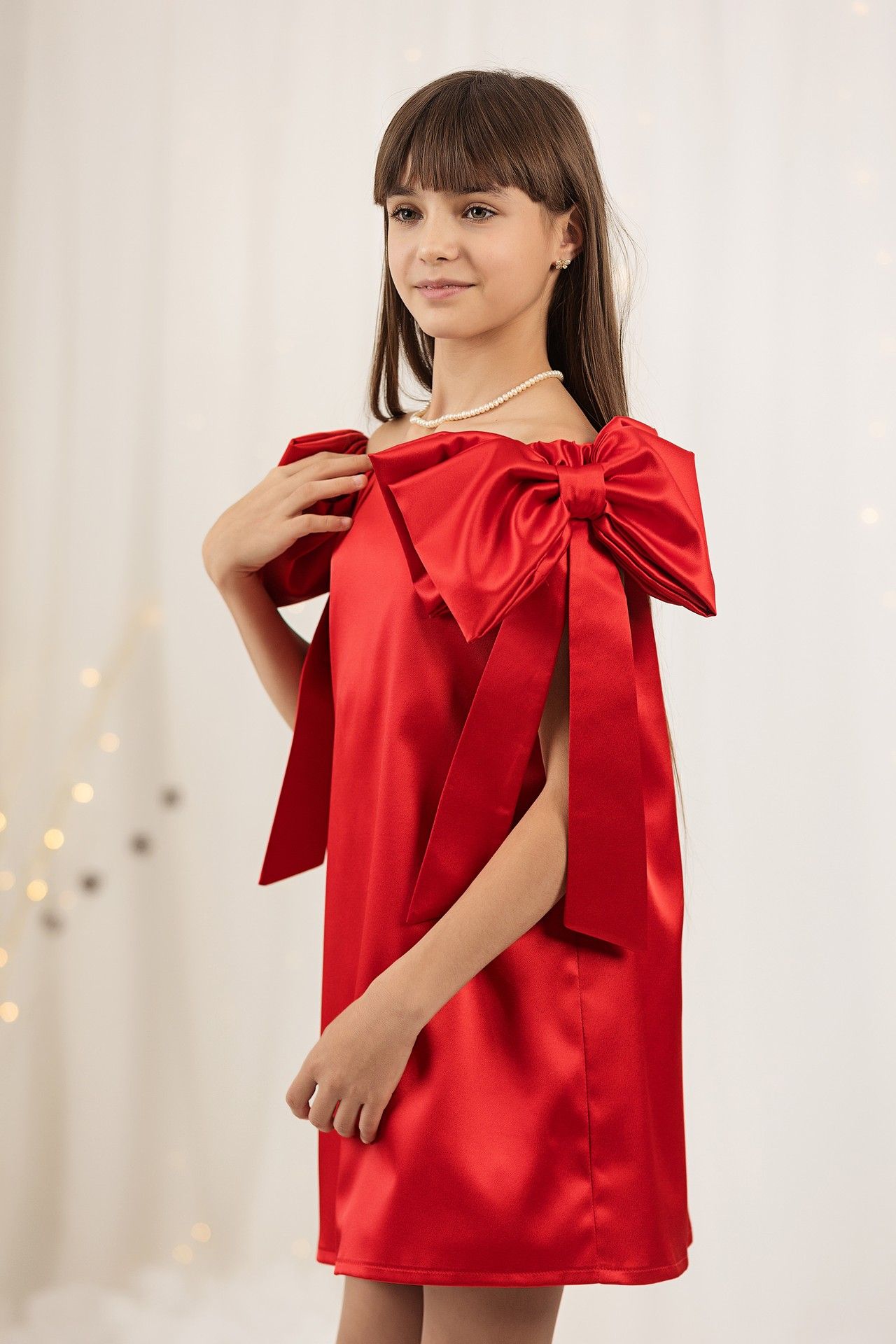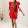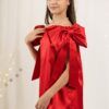 Made from rich red taffeta, it offers a soft sheen and crisp structure that give the dress a luxurious, couture-like finish. The standout detail—delicate ribbon ties on each shoulder—adds a graceful, feminine touch while allowing for a customizable fit.